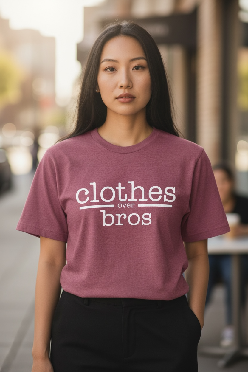 Show your love for Tree Hill's iconic fashion empire with this "Clothes Over Bros" T-Shirt in a soft Heather Mauve shade. Inspired by Brooke Davis' legendary clothing line, this tee is a must-have for One Tree Hill fans. Crafted from a soft cotton blend, it offers a comfortable fit perfect for everyday wear. Whether you're reminiscing about your favorite episodes or adding to your fan apparel collection, this shirt lets you wear your Tree Hill pride with style.
